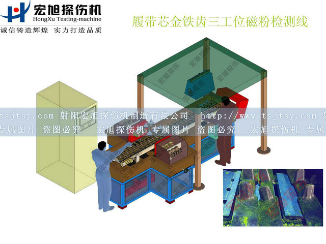 雙電極箱可調(diào)極間距,滿足各種尺寸履帶芯金鐵齒在一臺熒光磁粉探傷機上可通用檢測。